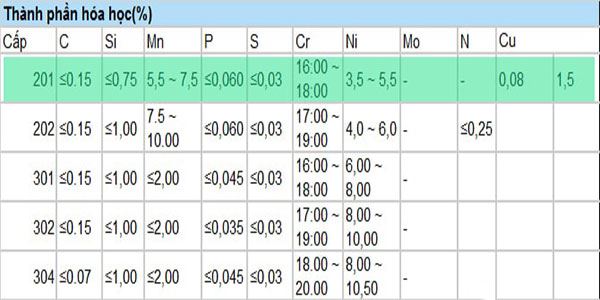 Thành phần hóa học của inox 201 gồm: 16-18% Cr, 3,5-5,5% Ni (Riêng hàng Việt Nam trong thành phần hóa học chứa Ni: 0.3-1.5%); 5,5 – 7,5% Mn,… cụ thể như sau: